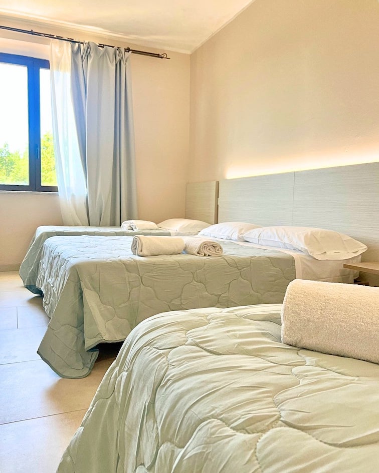 Questa camera dispone di quattro letti singoli o di un letto matrimoniale e due letti singoli, a seconda delle vostre esigenze, ed è dotata di tutte le comodità necessarie per garantirvi un soggiorno confortevole e piacevole. Qui potrete condividere dei momenti unici con i vostri amici o familiari, immersi in un ambiente accogliente e familiare.